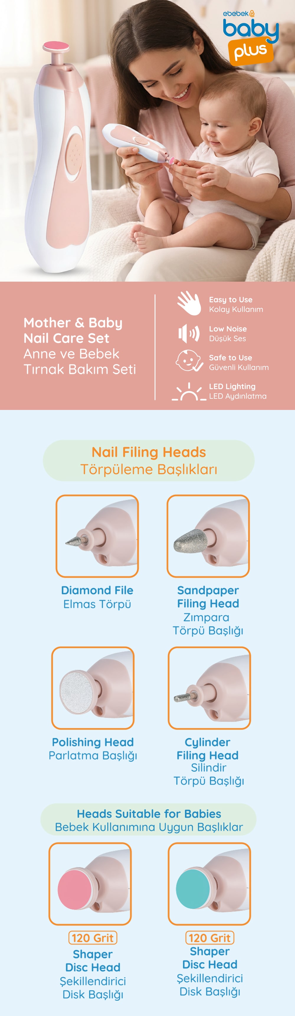 - Baby Plus Annebebek Tırnak Bakım Seti, bebeğinizin tırnak bakımını güvenli ve pratik şekilde yapmanızı sağlayan özel bir settir. Yuvarlatılmış kenarlı makas ve ergonomik sapıyla minik eller için tasarlanmıştır.
