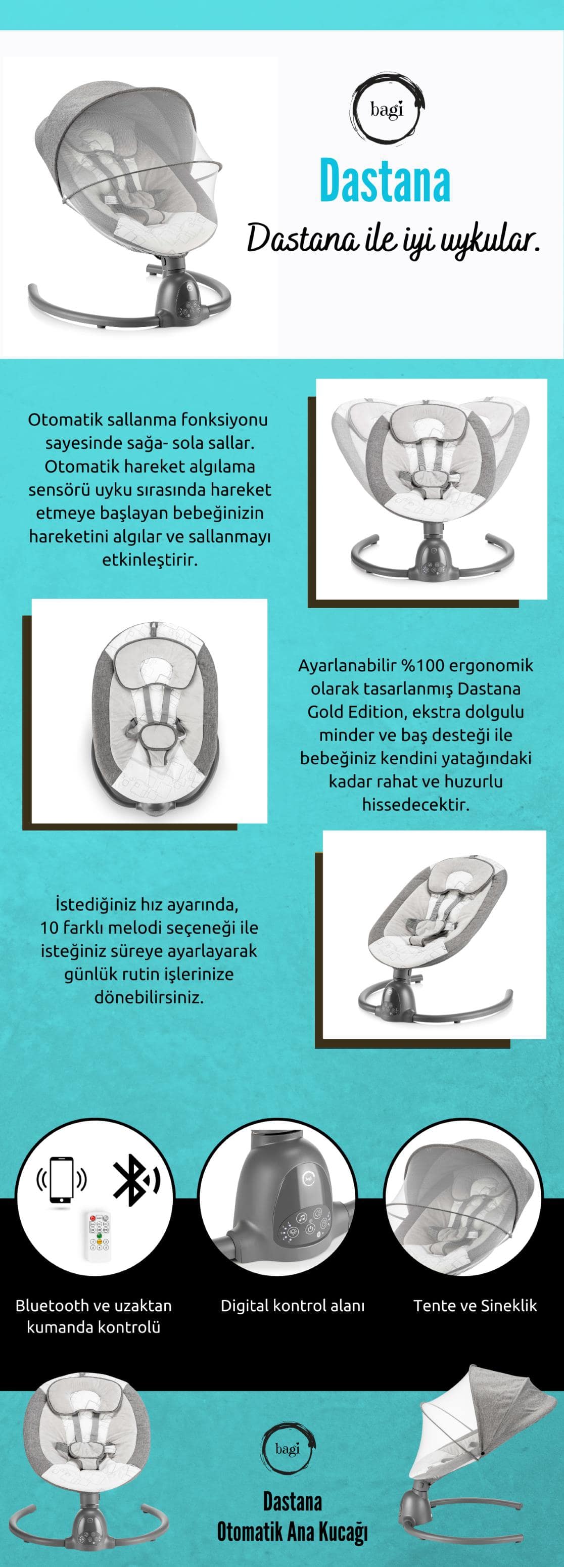 - Bagi Dastana Ev Tipi Ana Kucağı, bebeğinizin konforlu ve huzurlu vakit geçirmesi için özel olarak tasarlanmıştır. Doğumdan itibaren kullanılabilen bu ana kucağı hem güvenli hem de ergonomik yapısıyla bebeğinizin gelişim sürecine uyum sağlar. Şık görünümü, işlevsel özellikleri ve taşınabilir yapısı ile annelerin günlük rutinlerinde güvenilir bir yardımcıdır.