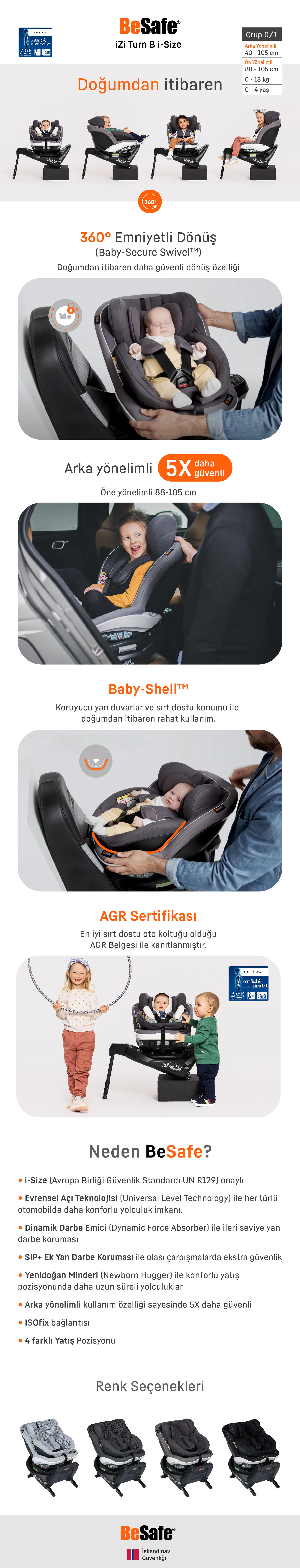 BeSafe iZi Turn B i-Size, UN R129 (i-Size) güvenlik standardı ile onaylanmış, 0–4 yaş aralığına (40–105 cm / 0–18 kg) uygun bir oto koltuğudur. 360° dönebilme özelliği sayesinde çocuğu koltuğa yerleştirme ve koltuktan çıkarma işlemini kolaylaştırır. Hem arkaya dönük (rear-facing) hem de öne dönük (forward-facing) kullanım imkânı sunan bu model, güvenlik ve konforu bir arada sunar.