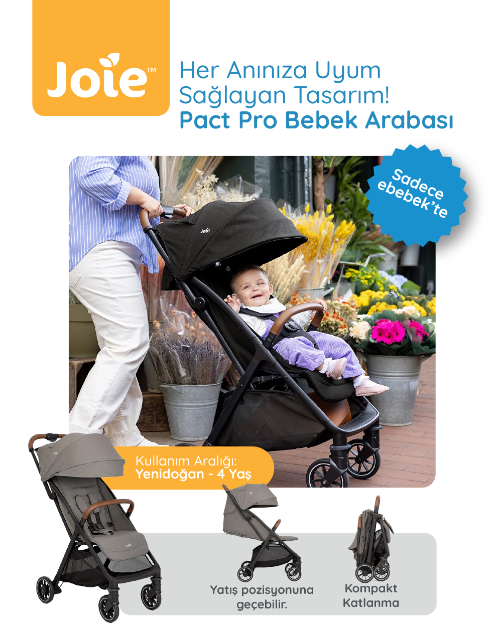 Joie Pact Pro, doğumdan itibaren yaklaşık 22 kg’a (4 yaşına) kadar kullanım imkanı sunar. Bu sayede uzun ömürlü bir kullanım sağlar. - Bebek arabası tek elle katlanabiliyor mu?